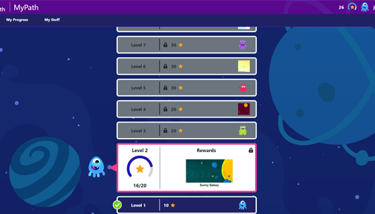 The middle school experience continues to adjust and adapt for older students with new backgrounds and sidekicks designed specifically for them. They will continue to earn stars and level up by completing lessons.